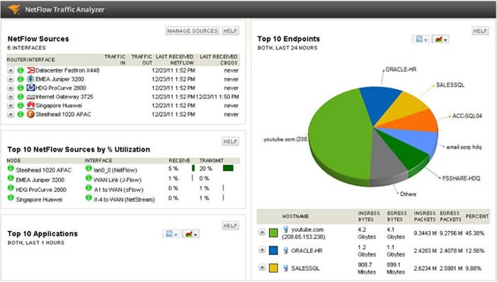 + A NetFlow reporting tool: there are many tools that can collect NetFlow packets sent to the NetFlow Collector and display a comprehensive view. Below is an example of what SolarWinds NetFlow Traffic Analyzer can analyze: