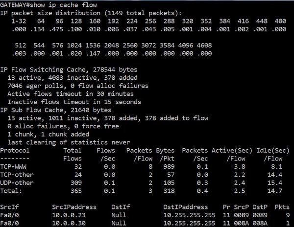 + Command Line Interface (CLI): Because the NetFlow cache is a part of the NetFlow Exporter so we can view this cache directly via the Command-Line-Interface (CLI), which is very useful for troubleshooting, with the “show ip cache flow” command. An example output of this command is shown below: